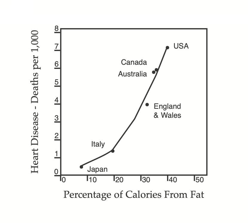 Utilisant les résultats de ces sept pays, Keys établit le lien de causalité suivant : les graisses saturées entraînent une augmentation du cholestérol, ce qui a pour effet d’augmenter le taux de maladies cardiaques.