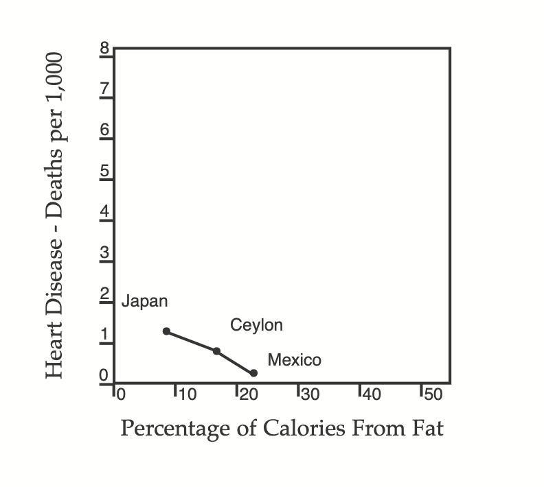 Si Ancel Keys avait plutôt décidé de faire un graphique avec les données disponibles pour le Japon, Ceylan et le Mexique alors il aurait obtenu le résultat ci-dessous, un graphique pointant vers l’hypothèse selon laquelle l’augmentation de la consommation de graisses réduit en réalité le taux de maladies cardiaques. On aurait été alors en totale contradiction avec les conclusions du scientifique.